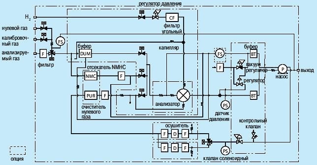 В конструкции прибора предусмотрен каталитический модуль для генерирования эталонного газа и дополнительного воздуха для возгорания. Все необходимые блоки встроены в корпус, пригодный для установки в 19'' стойку, включая каталитический модуль для селективного возгорания, т.е. устройство отсечения метана, каталитический модуль для генерирования эталонного газа и дополнительного воздуха для возгорания и насос. В качестве дополнительного газа требуется только Н2.
