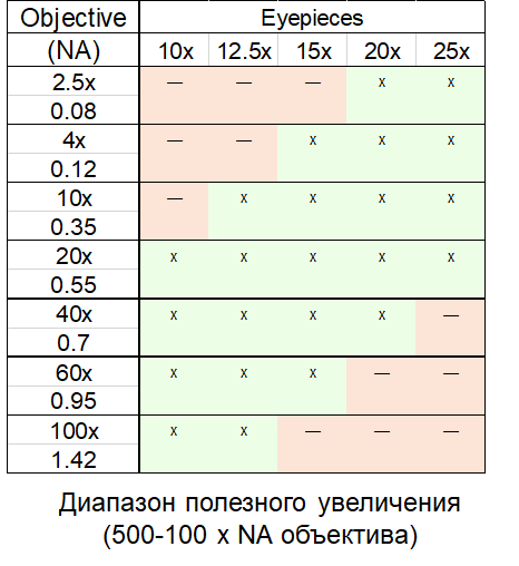 Существуют комбинации объектива и окуляра, которые лежат в диапазоне полезного увеличения.