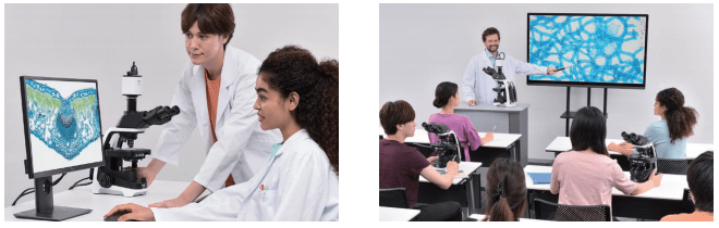 | Для групповых наблюдений Используя монитор для отображения наблюдаемого изображения с ECLIPSE Ei, группа людей может наблюдать один и тот же образец одновременно. | Для лекций и семинаров Камера Digital Sight 1000 легко подключается к большому дисплей для аудиторных лекций и семинаров. |