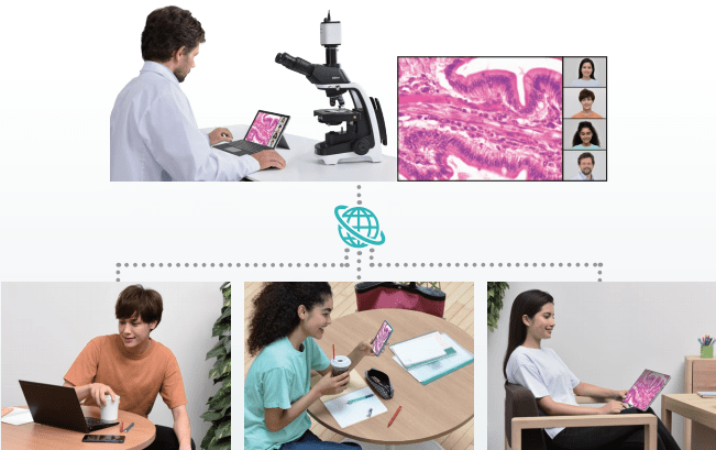 Подключив камеру Digital Sight 1000 к планшетному компьютеру, оснащенному программным обеспечением для обработки изображений NIS-Elements L, изображения образцов на ECLIPSE Ei можно легко передавать в режиме реального времени на ПК, смартфоны и планшеты. Эта система представляет собой мощный инструмент для удаленного обучения с использованием услуг онлайн-конференций.