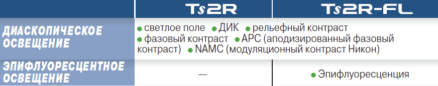 Светодиодный источник света высокой интенсивности позволяет реализовать широкий спектр методов наблюдения, подобно полноразмерному инвертированному исследовательскому микроскопу Eclipse Ti. В модели Ts2R-FL, в которой предложени эпифлуоресцентное наблюдение, предоставляется выбор из четырех каналов флуоресценции и 7 различных длин волн.