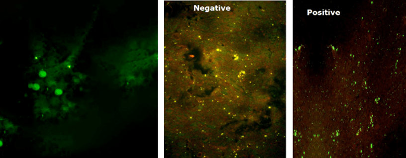 В данном случае нас интересует сигнал от красителя FITC. Наблюдение возможно благодаря специфической реакции «антиген-антитело» и ярком свечении меток под действием спектра возбуждение ~470-495нм. Исследователь наблюдает желтовато-зелёное свечение антигена бешенства (в нейронах и вне клеток, в виде мелких ярких зелёных гранул, на фото), в окрашенных препаратах не пораженная вирусом бешенства мозговая ткань светится тусклым, серовато-желтым цветом. В качестве материала для исследований выступают как отпечатки мозга, так и мазки гомогенизированных мозгов.